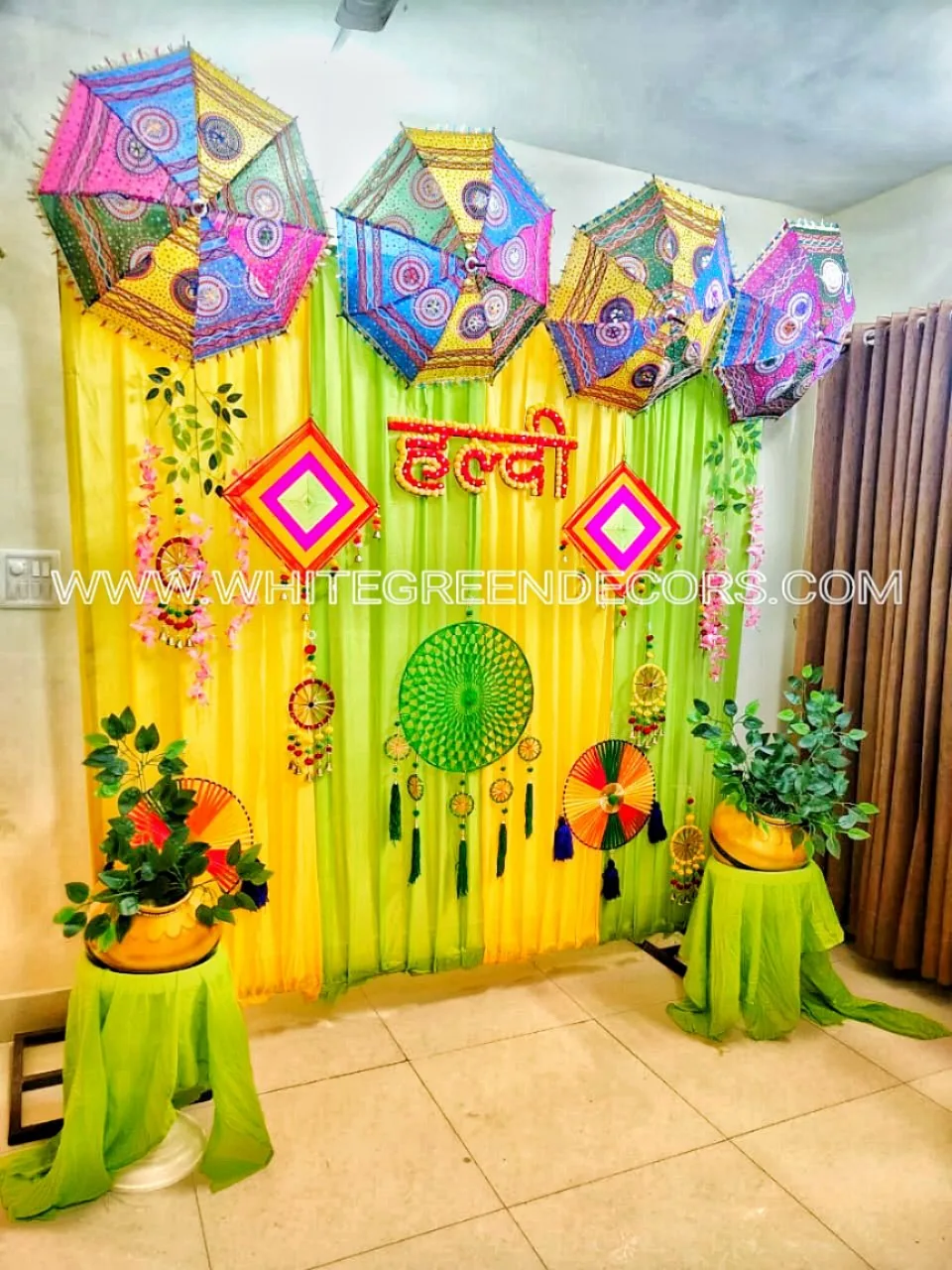 Yellow and green backdrop drapes styled with ethnic hangings and wall props