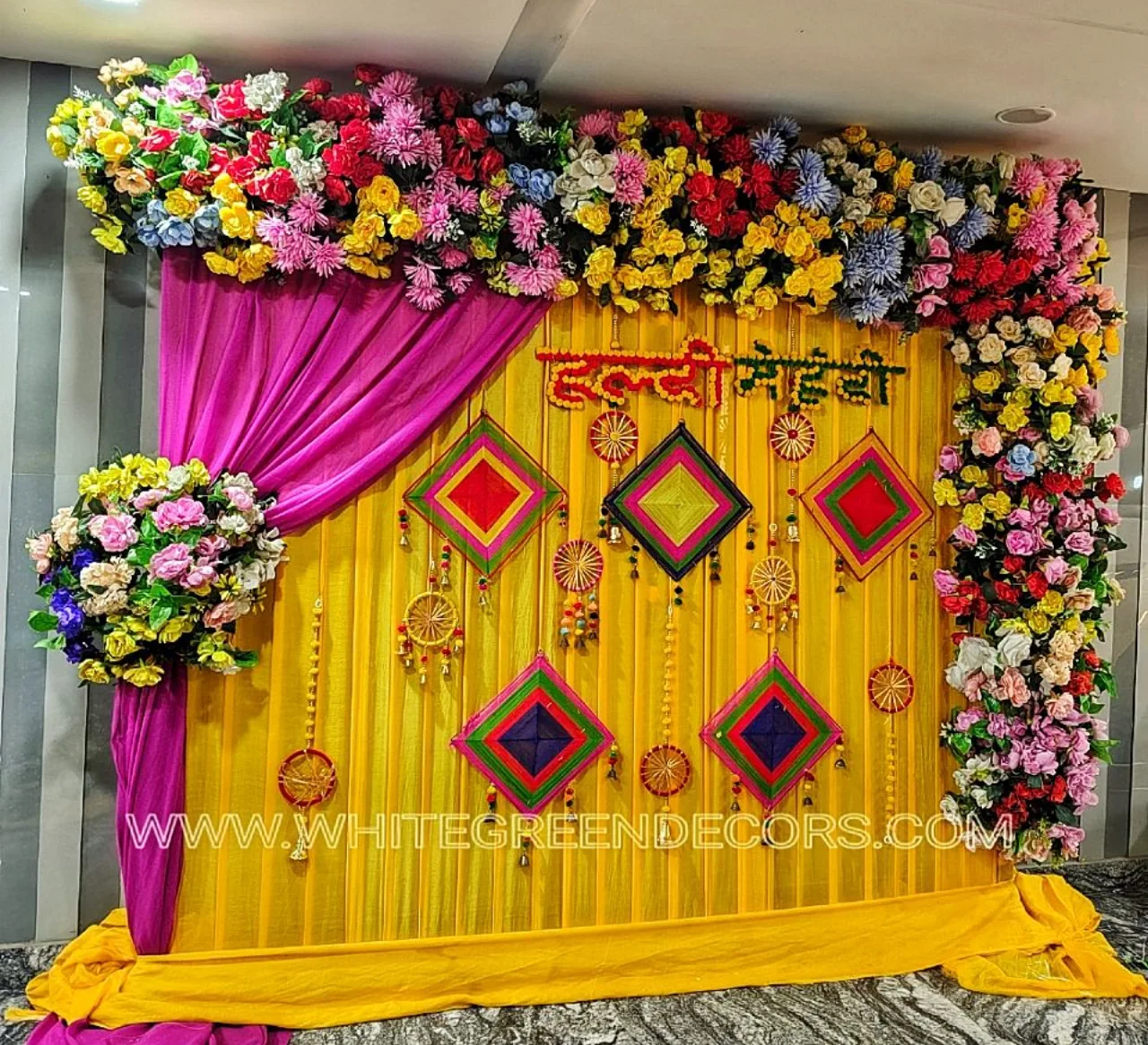 Give your pre-wedding celebrations a vibrant touch with this Haldi & Mehandi backdrop décor by White Green Decors. Designed with bold colors and traditional elements, the setup includes: