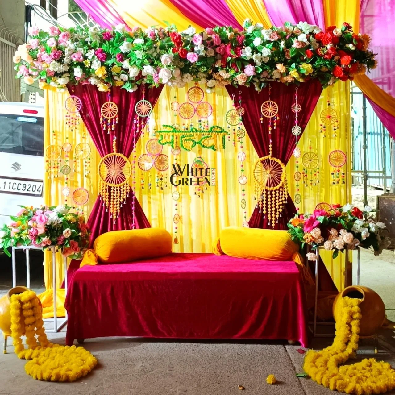 Celebrate your Mehandi ceremony with this colorful and artistic stage décor by White Green Decors. Blending traditional charm with modern design, the setup includes: