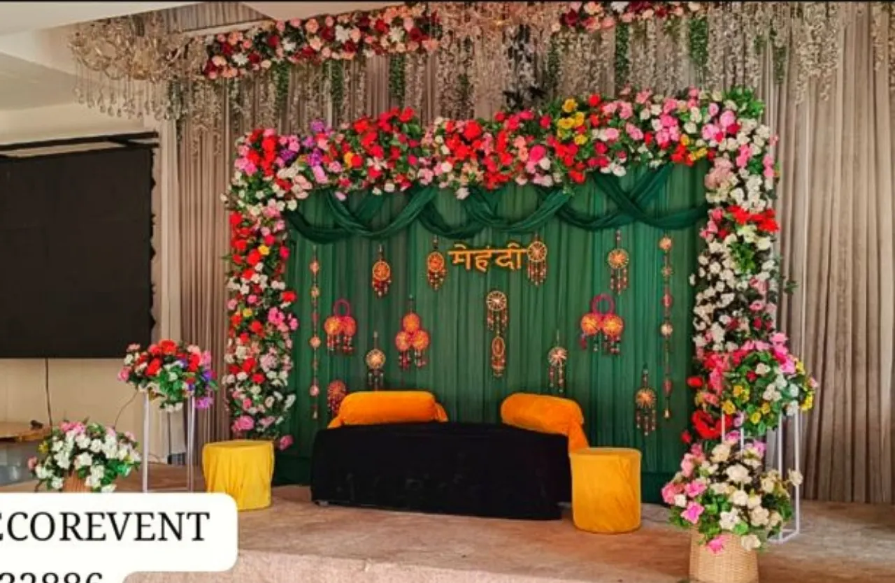 Enhance your Mehandi celebrations with this elegant stage setup featuring a deep green backdrop, vibrant floral borders, cozy sofa seating with cushions, and traditional hanging props. Perfect for creating a colorful and festive vibe at pre-wedding events like Haldi, Mehandi, and Sangeet.